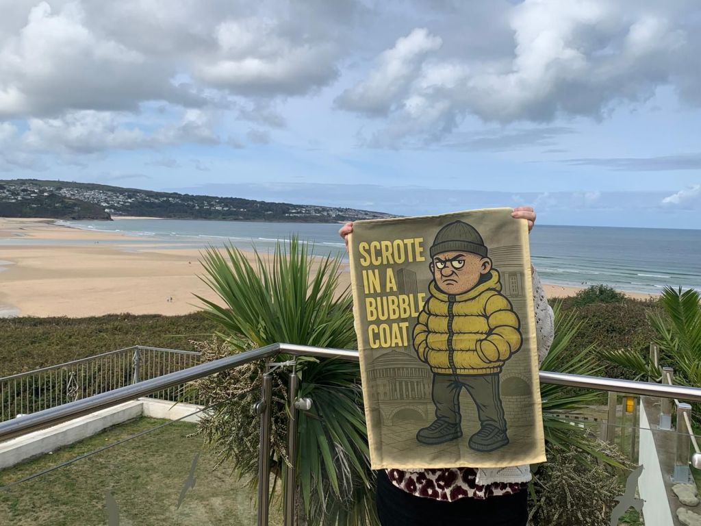 Scrote in a Bubble Coat Tea-towel ends up in Cornwall in the south of England.